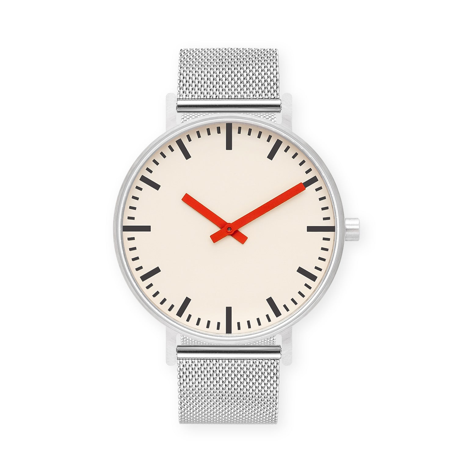 • B50 Watch, Silver Case, Off White Dial, Red Hand, Stainless Steel Mesh Strap